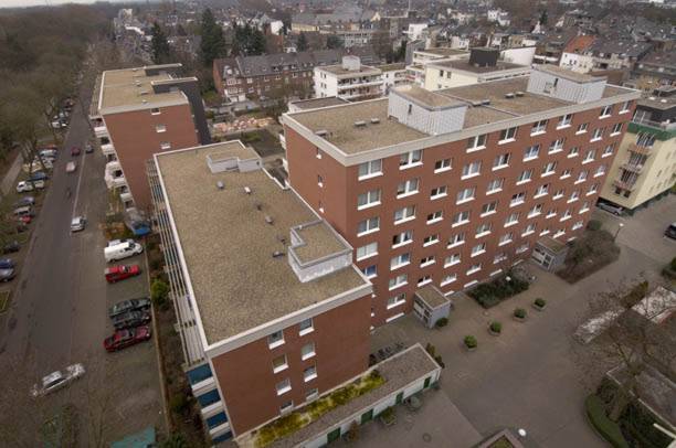 Die in den siebziger Jahren gebauten Häuser waren mit einer vorgehängten asbesthaltigen Faserzementfassade verkleidet, die bereits jeglichen Glanz und optischen Anspruch eingebüsst hatte. Mit dem Auftrag nach einer wirkungsvollen Isolierung in Verbindung mit einer langlebigen keramischen Bekleidung zu suchen, wandte sich die Hausverwaltung an das Architekturbüro Rausch in Neuss. Nach entsprechender Produktrecherche und ausgiebigen Systemvergleichen entschied man sich für den Böger-Systemklinker, der über den dortigen Vertriebspartner, der Firma Hölscher-Bauunternehmung aus Duisburg, angeboten wurde. Die werkseitig vorgefertigten Platten, mit den Abmessungen 112,5 x 69 cm, werden einfach durch eine, in den Systemklinkerelementen eingeformte Befestigungsbuchse, an die Außenwand geschraubt. Ergänzend zu den Platten gibt es komplette Eckelemente für die Einfassung von Öffnungen. Dort, wo die Elementmaße zu groß sind, schneidet man die Platten mit einem Winkelschleifer und einer Diamant-Trennscheibe zu. Dank einer nachträglichen Verfugung zwischen den Klinkerriemchen ist die Fassade nach außen hin schlagregendicht, gewährleistet eine windsogsichere Stabilität und ist somit wartungsfrei.